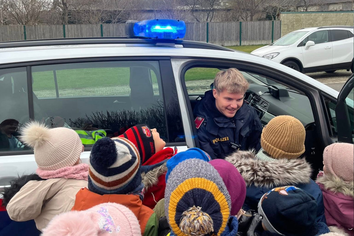 Die Polizeiinspektion Kittsee besuchte den Kindergarten Pama und erklärte den Kindern spielerisch die wichtigsten Sicherheitsregeln – vom Anschnallen im Auto bis zum Tragen eines Fahrradhelms.