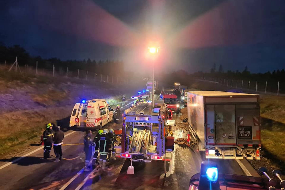 Zur gleichen Zeit lenkte ein 43-jähriger tschechischer Staatsbürger aus dem Bezirk Hollabrunn einen Lkw in die gleiche Richtung. Etwa bei Straßenkilometer 41,600 stieß der Lkw aus bisher unbekannter Ursache gegen das Heck des Zugmaschinengespanns. Der 43-Jährige erlitt dabei tödliche Verletzungen und wurde im Führerhaus des Lkw eingeklemmt. Er wurde von der Feuerwehr aus dem Fahrzeug geborgen.