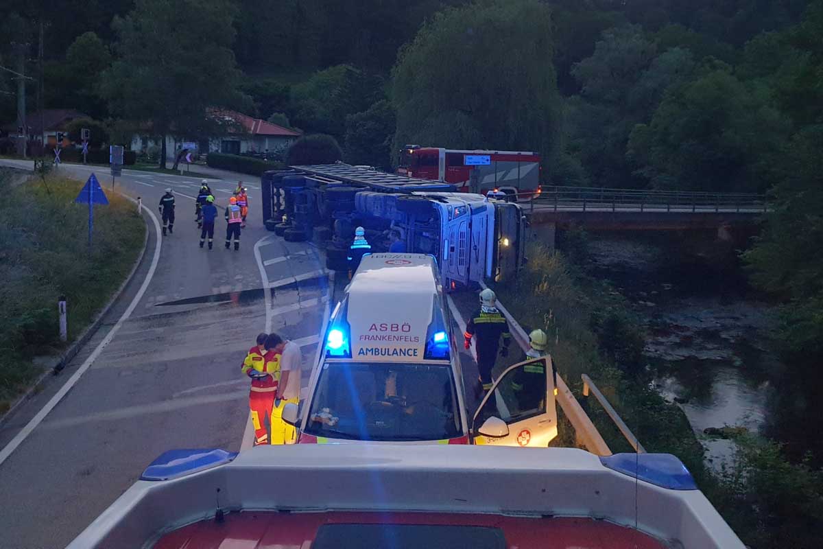 Beim Eintreffen wurde festgestellt, dass ein mit Stahlschrott beladenes Sattelzugfahrzeug samt Aufleger umgestürzt war und quer über die Fahrbahn lag. Der Rettungsdienst des ASBÖ Frankenfels versorgte bereits den leicht verletzten Lenker.