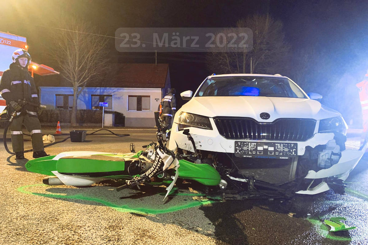 Ein alkoholisierter Lenker fuhr mit seinem unbeleuchteten Motorrad in Großpetersdorf (Bezirk Oberwart) gegen einen PKW und wurde dadurch verletzt.