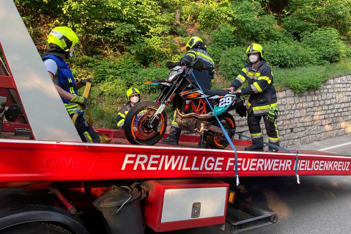 In Heiligenkreuz stieß der 37-jährige Motorradlenker gegen das Heck des vor ihm fahrenden Pkws und kam zu Sturz (Bildquelle: Feuerwehr Heiligenkreuz)