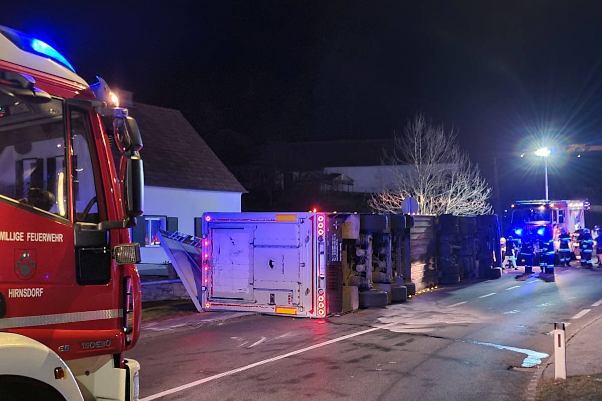 Gegen 05:15 Uhr fuhr ein 39-Jähriger aus Ungarn im Auftrag einer steirischen Transportfirma mit einem Sattelkraftfahrzeug auf der Wechsel Straße B54 aus Richtung Hartberg kommend in Richtung Hirnsdorf. Beladen war der Transporter mit 109 Lebendschweinen, die für einen Schlachthof in Graz bestimmt waren. Bei der Abzweigung in Richtung Feistritztalstraße L403 kippte das Fahrzeug vermutlich aufgrund überhöhter Geschwindigkeit nach links und beschädigte dabei eine Grundstückseinfriedung und eine Straßenlaterne. Dabei wurde das Dach des Anhängers beschädigt und eine kleine Anzahl der Schweine konnte entkommen.