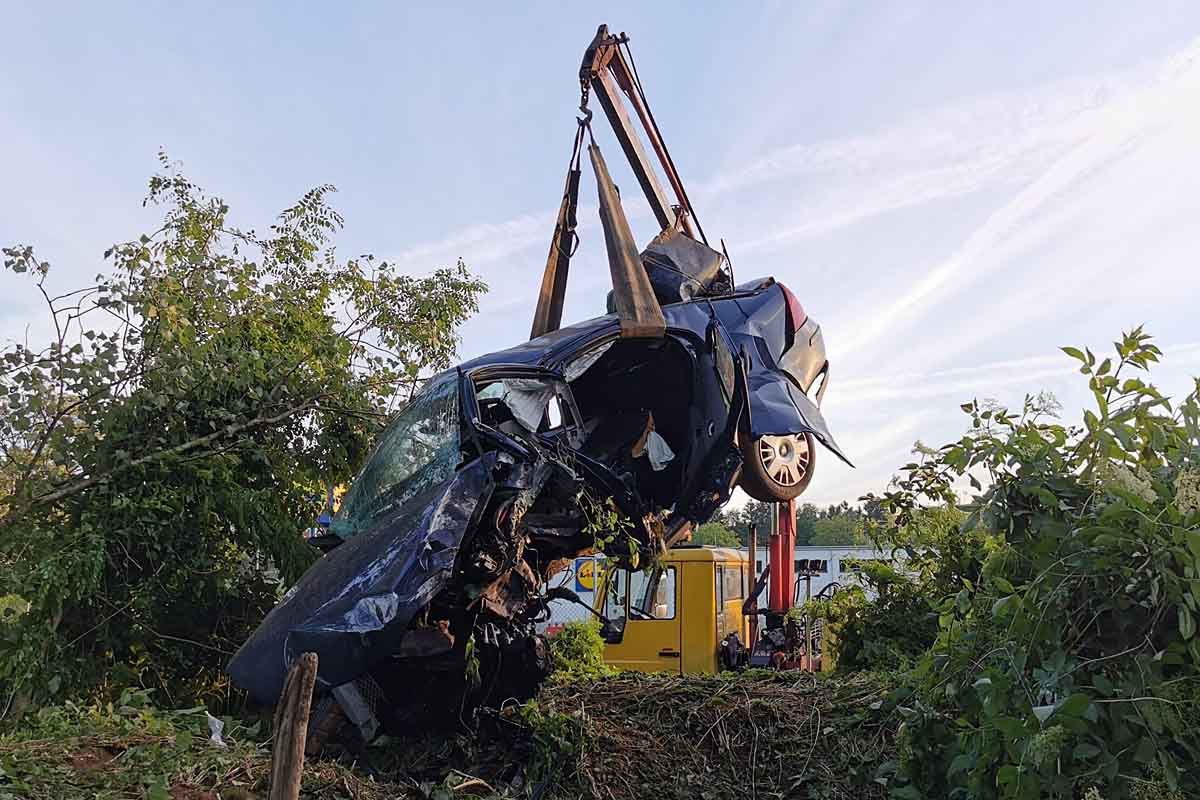 Der Pkw schleuderte heute über die Böschung, beschädigte mehrere Verkehrsleiteinrichtungen und blieb schließlich schwer beschädigt liegen.