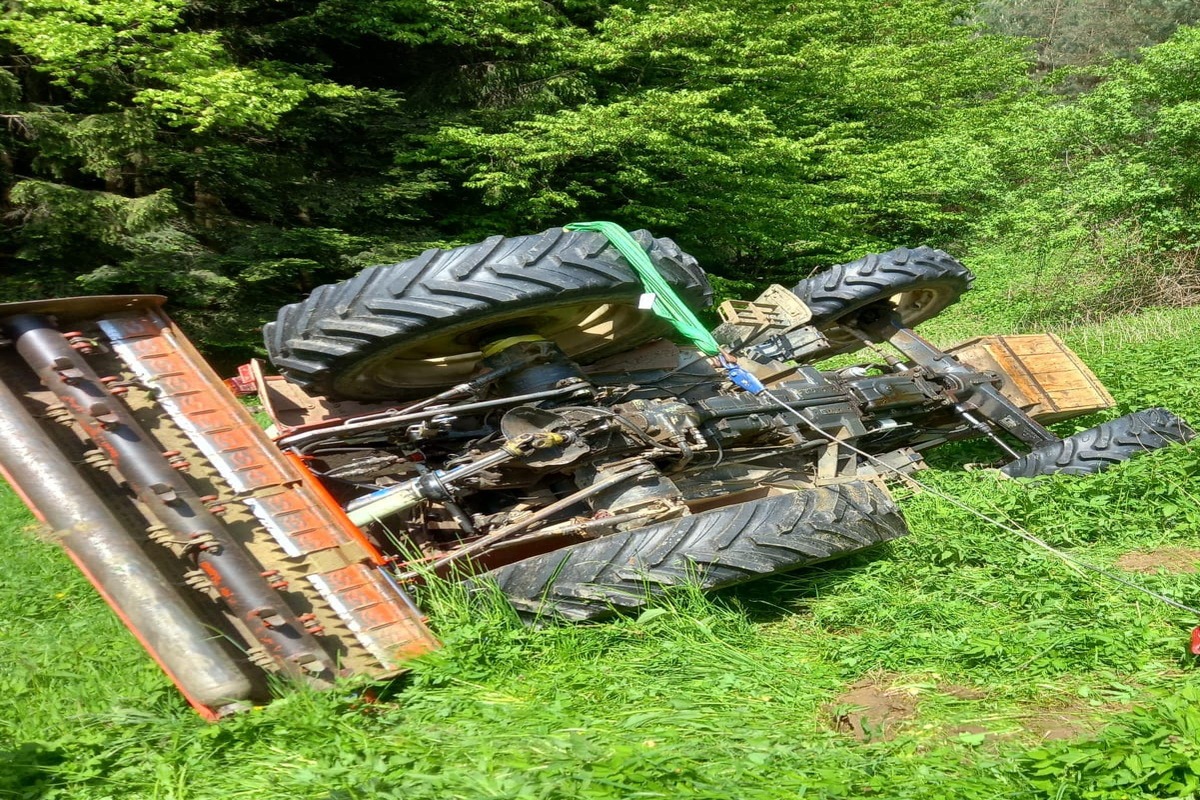 Am 06. Mai 2023, gegen 10:00 Uhr war der landwirtschaftliche Arbeiter mit einer Zugmaschine mit angespanntem Schlegelmulcher damit beschäftigt das Gras auf einem abschüssigen Wiesengrundstück niederzuschlegeln. Beim Bergabfahren auf dem nassen Grundstück, geriet das Fahrzeug außer Kontrolle und überschlug sich.