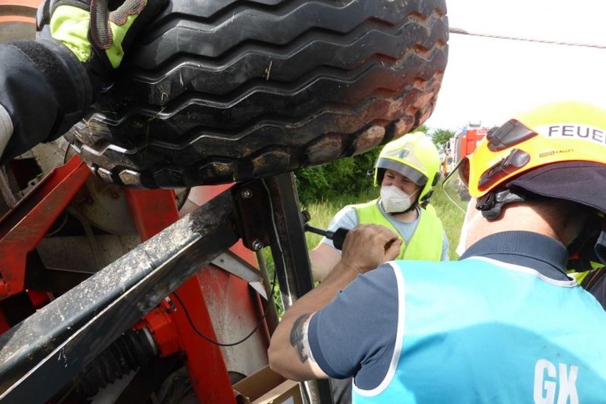 Nach Abschluss der Unfallaufnahme durch die Polizei wurde der Düngemittelanhänger provisorisch repariert, um eine Fahrt in die nächste Werkstätte zu ermöglichen.
