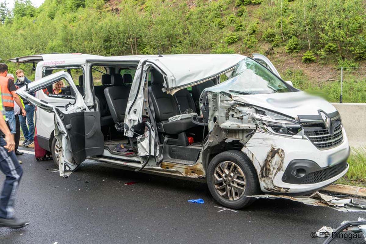Aus bisher ungeklärter Ursache kollidierte Sonntagfrüh, 13. Juni 2021, ein nahezu voll besetzter Kleinbus mit dem Anhänger eines Lkw. Zwei Insassen mussten ins Krankenhaus eingeliefert werden.