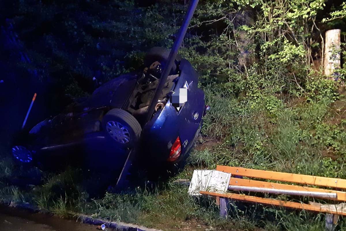 Durch den Aufprall an einem Betonschacht überschlug sich das Fahrzeug und schlitterte am Dach quer über die B21, ehe es in der Böschung bei der Bushaltestelle zum Stillstand kam.