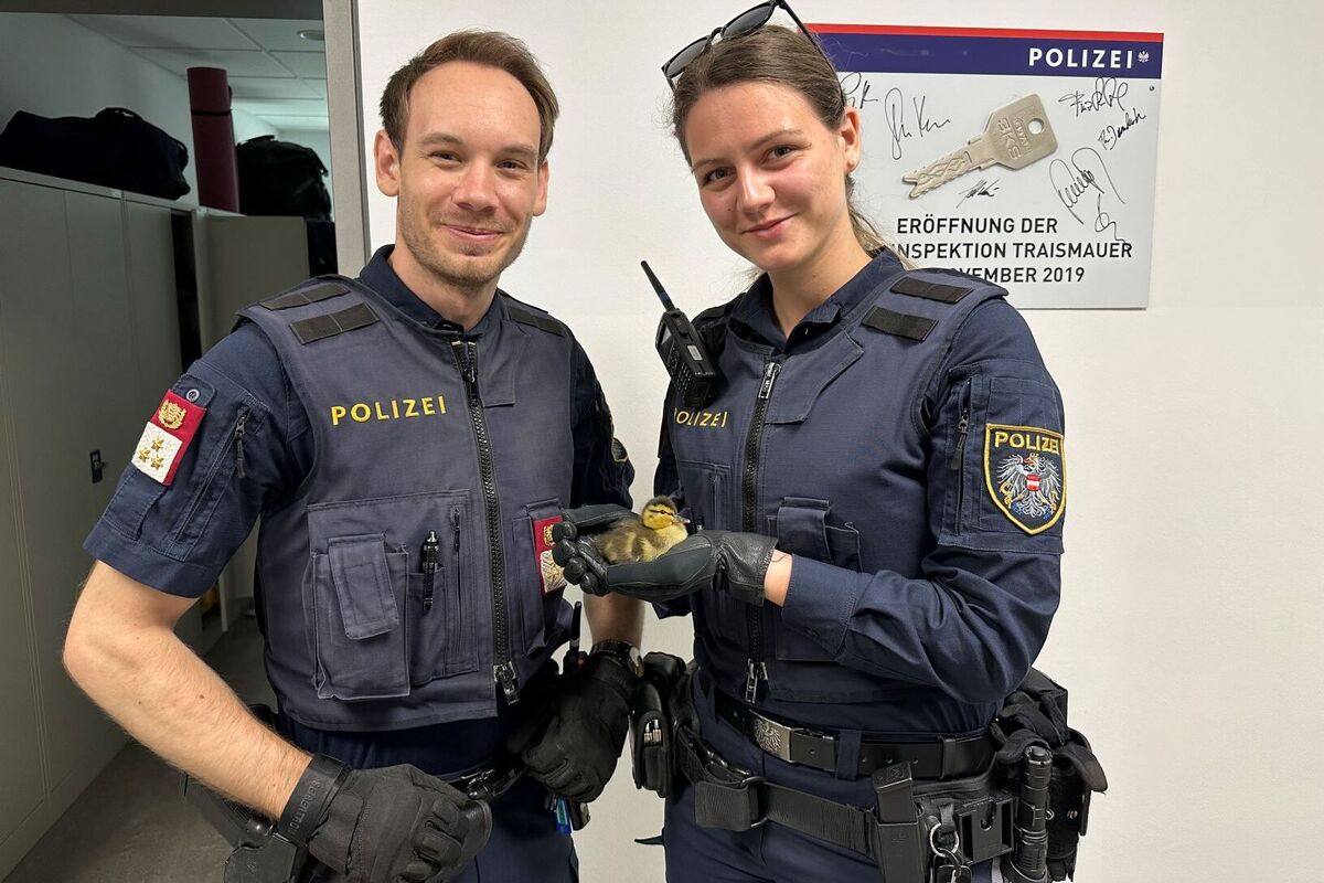 Auch konnten die Polizistin und der Polizist ein Entenküken verletzt und abseits der Entenfamilie wahrnehmen. Die Entenfamilie wurde von den Polizeibediensteten sicher über die Fahrbahn in einen Grünbereich geleitet.