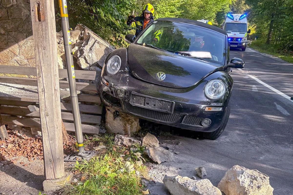 Der Einsatzleiter sprach auch von großem Glück für den verletzten Lenker, dass nicht das Dach der Gedenkstätte auf das Cabrio einstürzte. „Der letzte intakte Holzsteher hielt das Dach noch auf nur zwei Zentimetern“, sagte Höllermann.