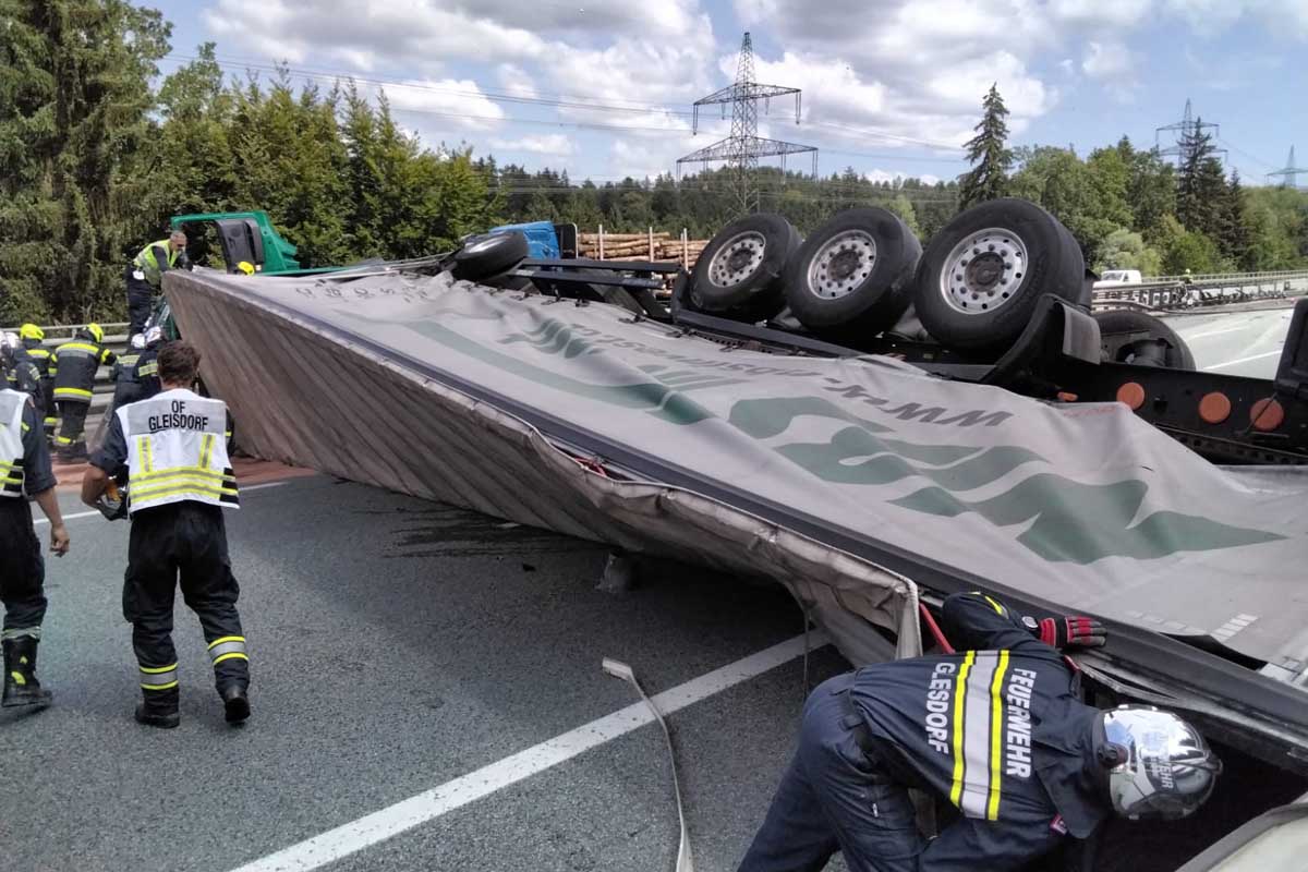 Ein lkw-Fahrer hat die kontrolle über sein fahrzeug verloren und hat die Mittelleitschiene durchbrochen und ist quer über die Gegenfahrbahn zum liegen gekommen.