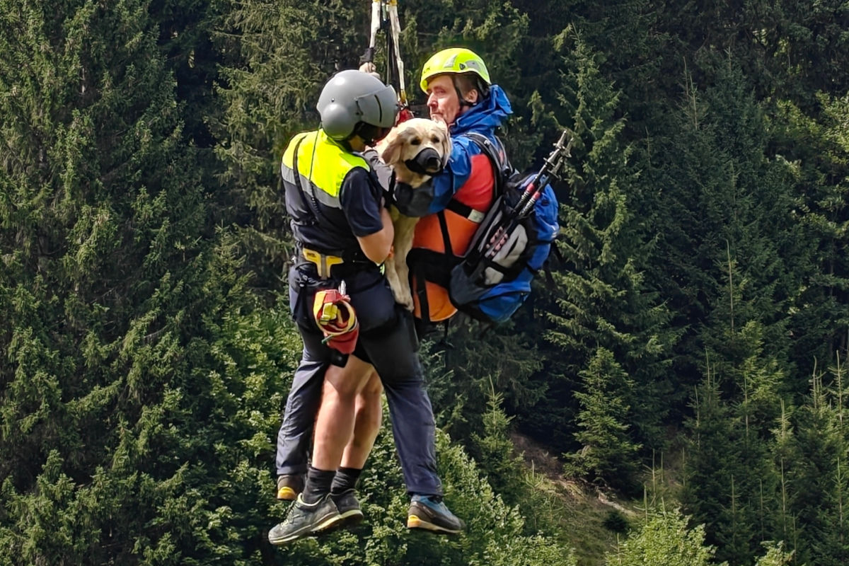 Die verängstigte Hündin flüchtete und stürzte rund 40 Meter in ein steiles Tobel. Der Besitzer konnte das Tier über einen Umweg erreichen, jedoch nicht mehr zurückkehren. Die Bergrettung Mittelberg rückte mit fünf Einsatzkräften aus und forderte die Flugpolizei an, die Hund und Halter per Taubergung sicher ins Tal brachte.